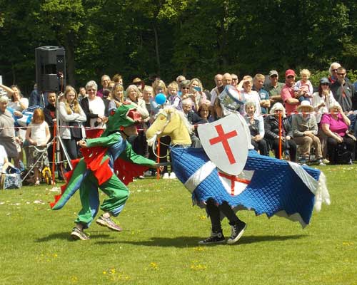 There are two arenas one for the fun dog show, the other for,everything from the crowning of the May Queen at the start to the Falconry Display and
